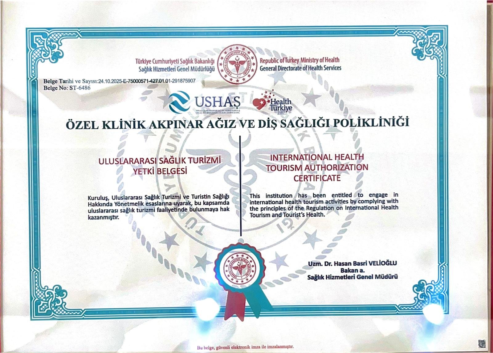 Kliniğimiz, uluslararası sağlık turizmi yapabilmek için gerekli olan tüm teknik donanım, hijyen ve uzmanlık kriterlerini başarıyla tamamlayarak Sağlık Turizmi Yetki Belgesi almaya hak kazanmıştır. Bu belge, sunduğumuz hizmetin devlet denetiminde ve yüksek kalite standartlarında olduğunun garantisidir.